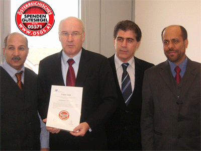 بعد مرور ثلاثة أعوام على تأسيسها حصلت هيئة إغاثة العراق في النمسا على شهادة ضمان التبرعات النمساوية. وهي أعلى شهادة تمنحها جهة نمساوية للمؤسسات الإنسانية غير الربحية.
