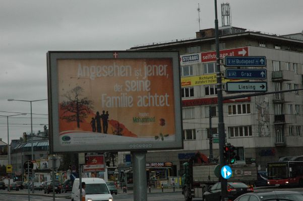 ومن المقرر أن يتم نصب المئات من اللوحات الإعلانية الكبيرى بينها 163 لوحة إعلانيهة متحركة ( رولينج بودز ) وكذلك 105 لوحة إعلانية مضاءة “سيتى لايتس” ستوزع فى الميادين ومفترقات الطرق والساحات الرئيسية بمختلف المدن النمساوية، في العاصمة فيينا ونحو 5 مدن نمساويه كبرى والتي تحمل نص الحديث النبوي الشريف القائل: ” خَيْرُكُمْ خَيْرُكُمْ لِأَهْلِهِ…”، باللغة الألمانية.