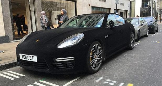 فالسيارة وهي من طراز بورشة بانيمارا قد تم تغليفها بالكامل بالمخمل “القطيفة” السوداء باهظة الثمن، وهو أسلوب حياة يحاول الأثرياء ونجوم الفن والرياضة أن يتبعوه، ليعكسوا مدى ثرائهم وترف حياتهم اليومية.