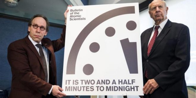 أعاد علماء نوويون ضبط ساعة “يوم القيامة” الرمزية إلى أقرب نقطة من ساعة الصفر منذ 64 عاما، قائلين إن العالم أقرب إلى كارثة بسبب مخاطر مثل الأسلحة النووية وتغير المناخ وانتخاب دونالد ترمب رئيسا للولايات المتحدة.