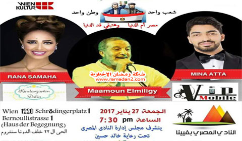 يشارك فى الأحتفال الفتى الكبير الفنان المصرى المعروف مأمون المليجى أبن العاصمة الصيفية “الاسكندرية” للمرة الثانية بعد أن أحيى حفل سابق بمناسبة أنتصارات أكتوبر العظيمة ولأول مرة بفيينا نجوم ستار أكاديمى الفنانة رنا سماحة والفنان مينا عطا.