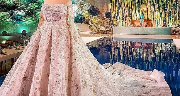 وكان فستان العروس من تصميم العالمي رامي القاضي، الذي تميز بالشكل الملكي، بوجود التطريزات في جميع أجزاء الفستان، مع الذيل الطويل جدًا، بحسب ما ظهر خلال فيديو قصير على صفحة المصمم.