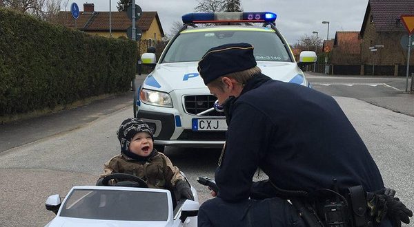 نشرت مواقع سويدية صورة طريفة لشرطي يوقف طفلاً، يبلغ من العمر عاماً واحداً، يقود سيارة صغيرة وفاخرة من نوع “أودي”.