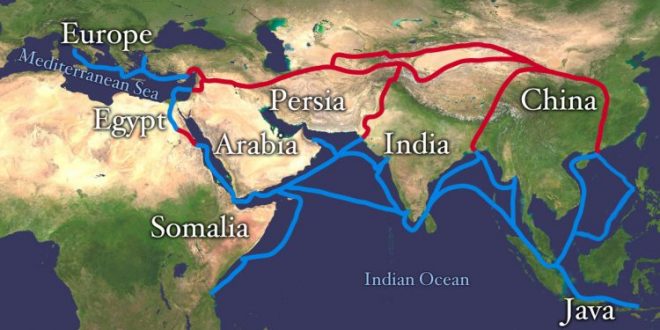 طريق الحرير، المهم اقتصاديًا للهند (باللون الأحمر)، وطرق تجارة التوابل قديمًا (باللون الأزرق) ( مصدر الصورة : Wikimedia / C.C By A-Sh 3.0 )