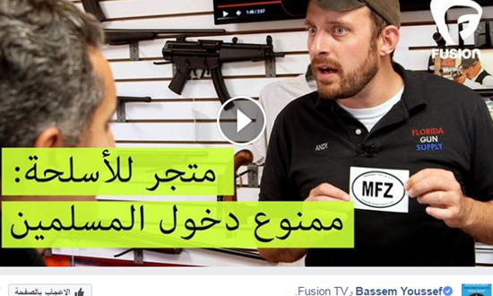 ونشر “باسم يوسف” عبر صفحته الشخصية، خلال برنامجه “كتيب الديمقراطية مع باسم يوسف”، والذي يعرض حلقاته بقناته على موقع “يوت يوب”، فيديو مصور بطريقة سرية، داخل متجر للسلاح، موضوع عليه لافته، “ممنوع دخول المسلمين”، حيث علق على الفيديو قائلاً: “زرت متجر ممنوع فيه المسلمين بولاية فلوريدا الي ابدعو بطرق مبتكرة ليبعدو المسلمين عنهم”، حيث يستخدم أصحاب هذا المتجر، بعض الحيل من أجل الكشف عن هوية من يترددوا على المتجر، وما إذا كانوا مسلمين أم لا.