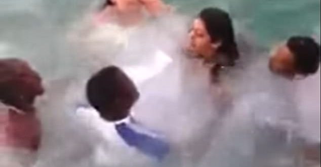 يظهر في الفيديو الذي نشرته صحيفة “ديلي ميل” البريطانية قيام عروس بالقفز في المياه وهي ترتدي الفستان، مما تسبب في تغطية الفستان لوجهها، وقربها من الغرق في المياه، الأمر الذي أدى إلى قفز الجميع إليها وبدأوا في محاولتهم إزاحة الفستان عن وجهها، حتى نجحوا.