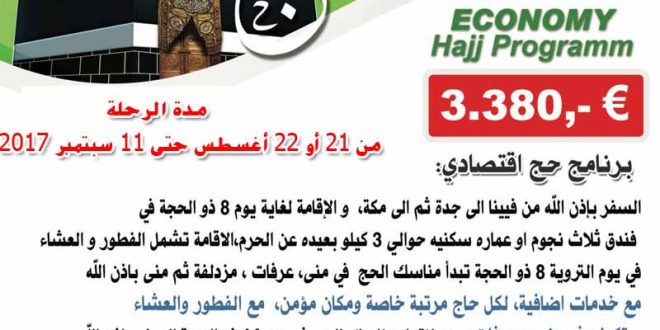 يسر شركة سكاي دانوبيا أن تعلن عن مفاجأة موسم الحج للعام الجاري 2017 م – 1438 هـ ؛ حيث فتحت الباب لإمكانية تقسيط تكاليف الحج لجميع الراغبين بأداء الفريضة.