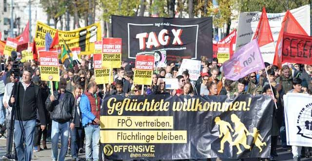 ورفع المتظاهرون لافتات كتبت عليها عبارات من قبيل “ليذهب حزب الحرية، وليأتي اللاجئون” ، و”لا لصعود اليمين”، و”تضامن ضد العنصرية”.