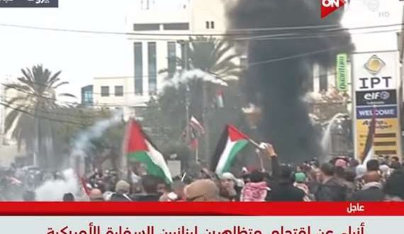 عرضت فضائية “أون لايف” مقطع فيديو يرصد لحظة اقتحام المتظاهرين اللبنانيين السفارة الأمريكية حاملين الأعلام الفلسطينية، مرددين هتافات “القدس عربية”، ولكن قوات الأمن فرقتهم باستخدام الغاز المسيل للدموع والمياه
