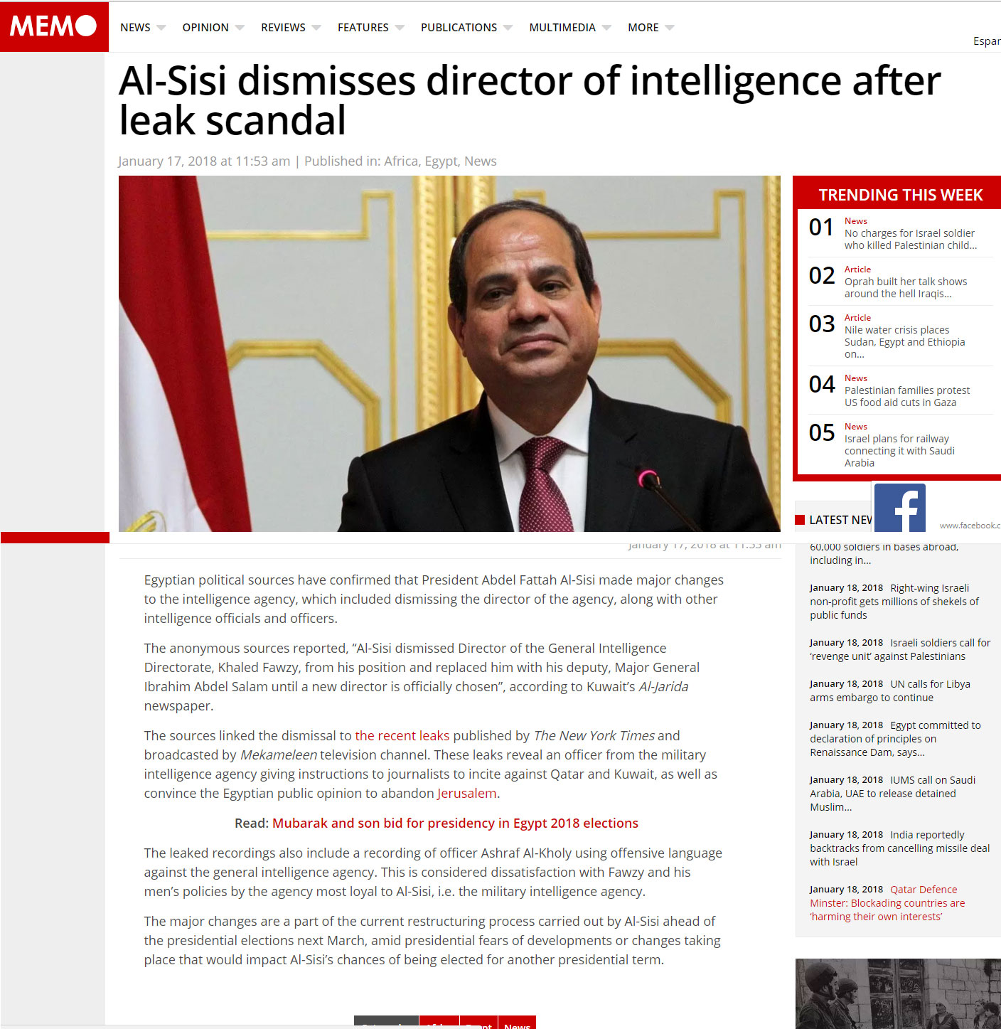 وربطت المصادر بين إقالة وبين التسريبات الأخيرة التي نشرها في صحيفة نيويورك، وبثتها قناة “مكملين” التلفزيونية، وتعود التسريبات إلي أحد الضباط وهو يعطي تعليمات للصحفيين للتحريض ضد قطر والكويت وتعليمات مفادها إقناع الرأي العام المصري للتخلي عن القدس.