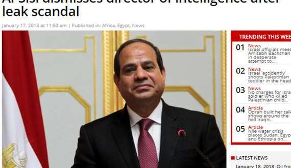 كشف موقع “ميدل إيست مونيتور” البريطاني، عن أن الرئيس المصري عبدالفتاح السيسي، قام بتغييرات في مناصب قيادية في جهاز المخابرات العامة، الأمر الذي اعتبره الموقع أول رد من النظام على تسريبات صحيفة “نيويورك تايمز” الأمريكية.