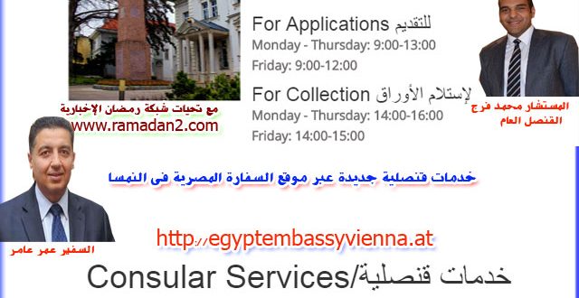 في بادرة جديدة تهدف الى تسهيل خدماتها الى ابناء الجالية المصرية فى النمسا اطلقت ، القنصلية العامة المصرية فى فيينا ، خدمة جديدة عبر موقعها الألكترونى على شبكة الخدمات الدولية “الانترنت” ” http://egyptembassyvienna.at/” السماح للمواطنيين بأمكانية تحديد موعد الحضور ومعرفة المستندات المطلوب أحضارها قبل التوجة إلي مقر القنصلية .