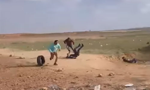 ويُظهِر الفيديو الفتى وهو يرتدي ملابسه السوداء، ويفرُّ بعيداً عن السياج الحدودي الذي يفصل غزة عن إسرائيل، وهو يحمل إطارَ سيارة.