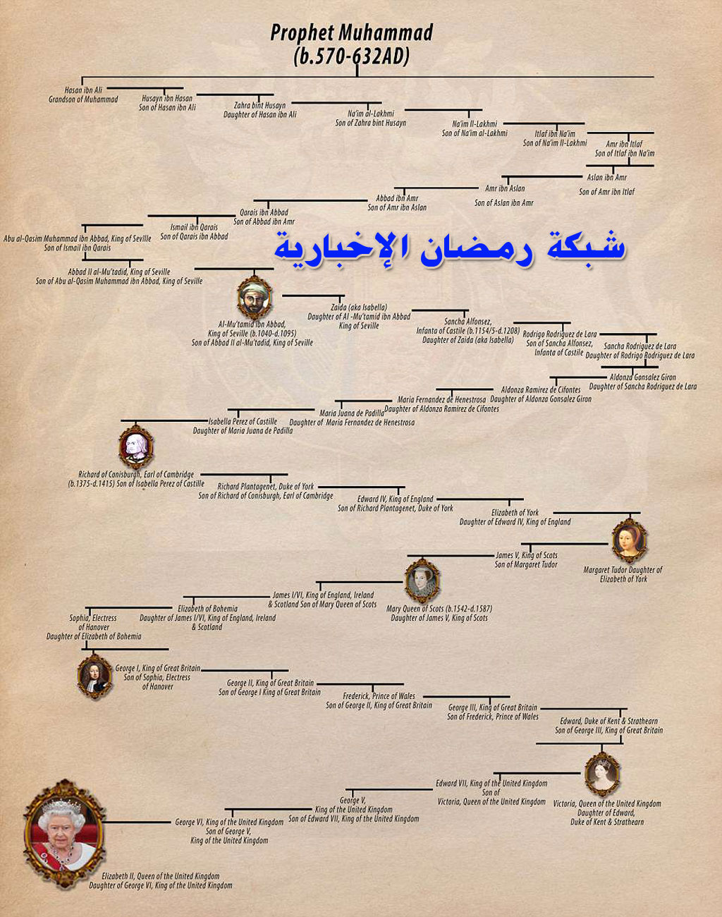 وظهرت شجرة تفصيلية للعائلة التي جاءت منها الملكة إليزابيث، ما يضفي المزيد من الدراما على القصة. فقد نشرت صحيفة The Daily Mail البريطانية شجرة عائلة الملكة بتصميم إنفوجرافيك تضمَّن ما قالت إنه سلسلة نسب الملكة الذي ينتهي بالرسول محمد. مجلة The Economist أشارت إلى عناوين تصدَّر مؤخراً جاء فيها: “يجب أن تطالب الملكة إليزابيث بحقها في حكم المسلمين”.