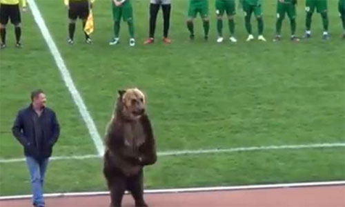 الدب الملقب بـ “تيم” والمدرَب على الاستعراض أمام الجماهير قبَّل الكرة وسلمها للحكم قبل انطلاق المباراة، ثم بدأ بالتصفيق للجماهير.