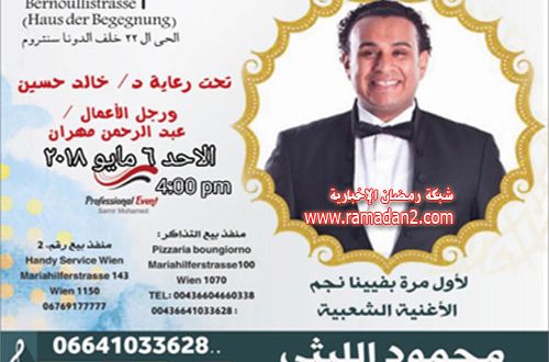 يحيي المطرب الشعبى محمود الليثى حفلاً كبيرا للجاليه المصرية والعربيه لاول مره في العاصمه النمساويه ” فيينا ، يوم الأحد الموافق 6 من مايو المقبل ، بمقر قاعة الأحتفالات الكبر بالحى الثانى والعشرين خلف المركز التجارى المعروف بأسم الدوناو سنتروم ” Donauzentrum”، يبدأ الحفل فى تمام الساعة الرابعة عصرأ .