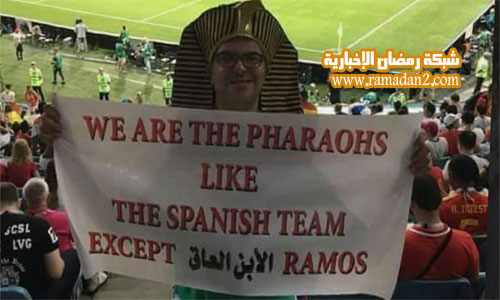 المباراة التي انتهت بتعادل إيجابي لثلاثة أهداف لكل منهما، ظهر فيها المشجع وهو يحمل لافتة كتب عليها باللغة الإنجليزية بما معناه: “نحن الفراعنة نشجع الفريق الإسباني ما عدا الابن العاق راموس”.