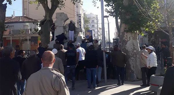 وأظهر مقطع فيديو وصور تناقلتها مواقع التواصل الاجتماعي على نطاق واسع، ملتحيا وهو يعتلي منصة التمثال في وقت يحاول عدد كبير من المواطنين إنزاله ومنعه من تخريب التمثال، في حين أظهرت الصور تعرض رأس التمثال إلى تخريب طفيف.