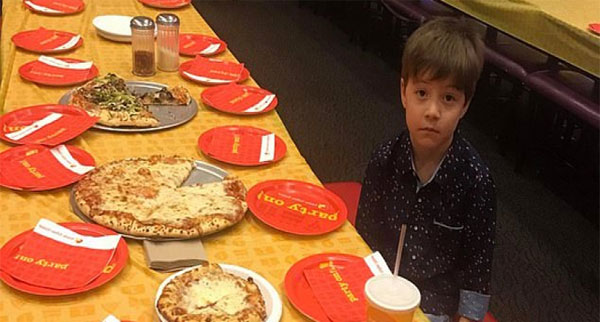 إذ جلس هذا الطفل العابس وحيداً بين أكثر من 30 مقعداً فارغاً، وفطائر بيتزا لم يأكلها أحد، انتظاراً لمفاجأة في عيد ميلاده السادس.