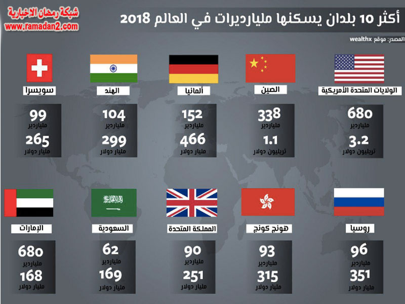 أصدر موقع «إكس ويلث» قائمته الأحدث لأكثر البلاد التي يعيش فيها مليارديرات في العالم لعام 2018، وأفاد الموقع المتخصص في حساب تعداد المليارديرات في العالم، وتقدير حجم ثرواتها، بأن أمريكا يوجد بها ربع مليارديرات العالم، بالرغم من أن تعدادها السكاني يمثل 4% فقط من إجمالي سكان العالم.