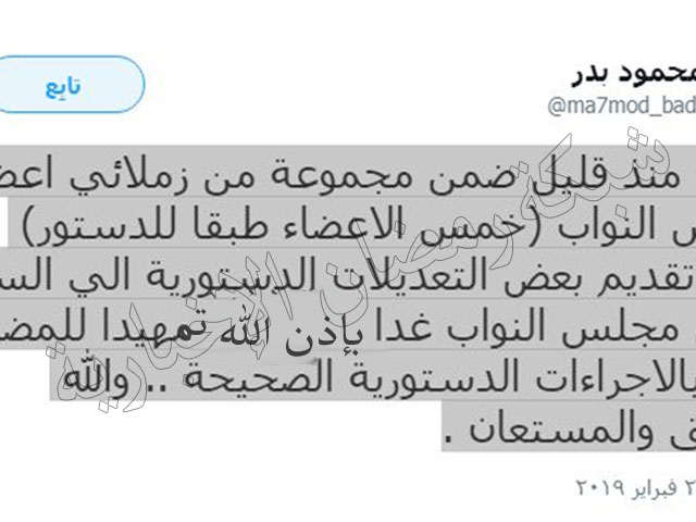 وقال بدر عبر حسابه على موقع “تويتر”: “وقعت منذ قليل ضمن مجموعة من زملائي أعضاء مجلس النواب (خمس الأعضاء طبقًا للدستور) على تقديم بعض التعديلات الدستورية إلى السيد رئيس مجلس النواب غدًا بإذن الله تمهيدًا للمضي قدما بالإجراءات الدستورية الصحيحة.. والله الموفق والمستعان”.