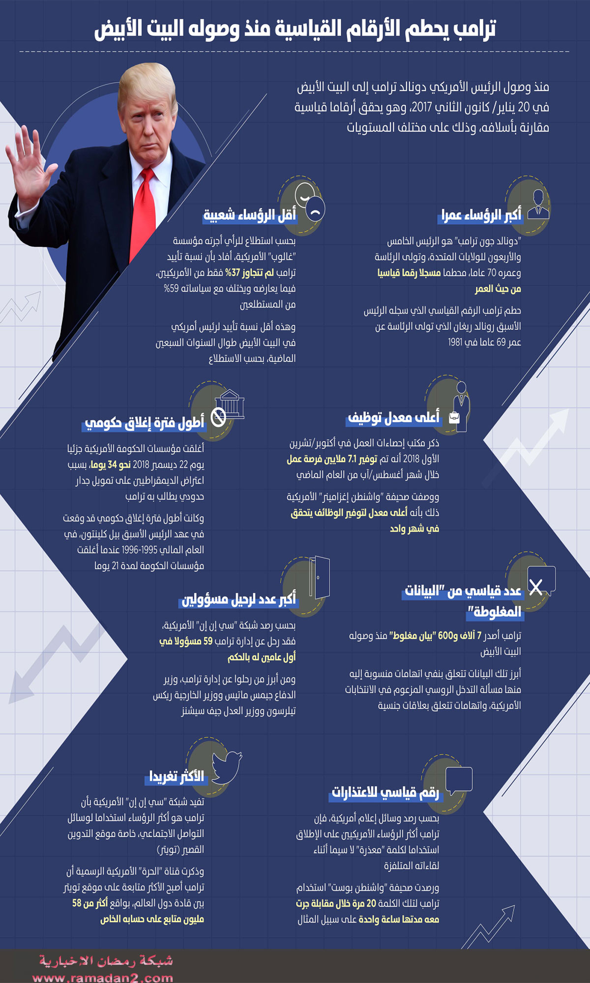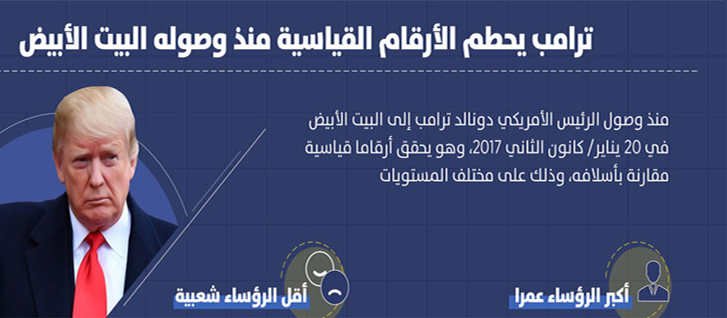 منذ وصول الرئيس الأمريكي دونالد ترامب إلى البيت الأبيض في 20 يناير2017، وهو يحقق أرقاما قياسية مقارنة بأسلافه من الرؤساء السابقين، وذلك على مختلف المستويات.