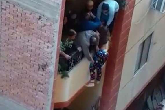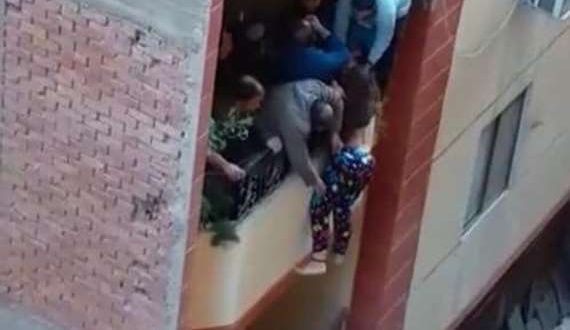 وأوضح الفيديو سيدة تتشبث بالعمود الحديدي للشرفة ، وحاول الجيران الإمساك بها وإنقاذها قبل أن تسقط من الشرفة.
