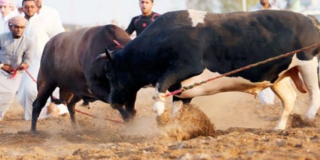 تداول ناشطون عبر موقع التدوين المصغر “تويتر” مقطع فيديو لمصارعة ثيران أقامها مواطنون عمانيون في محافظة صحار، وأثارت حالة من الجدل بعد وفاة أحد الثيران بطعنة من الثور المنافس.