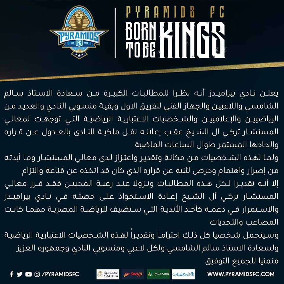 “إلا أنه تقديرا لكل هذه المطالبات ونزولا عند رغبة المحبين فقد قرر تركي آل الشيخ إعادة الاستحواذ على حصته في نادي بيراميدز”.