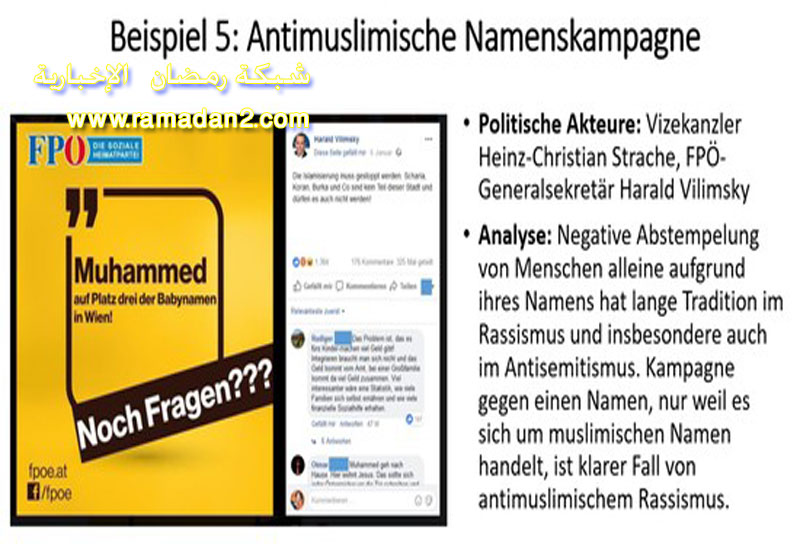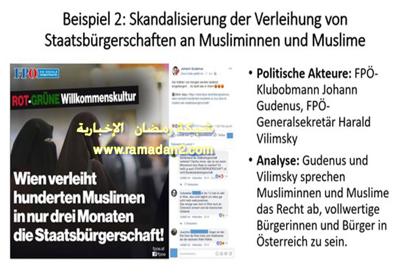 وجاء في الدراسة أن كبار السياسيين النمساويين، ومن بينهم نائب رئيس الوزراء، وعدد من الوزراء، شاركوا في 20 حادثة وحملة سياسية تتضمن محتويات إقصائية ومهينة ضد المسلمين، عام 2018.