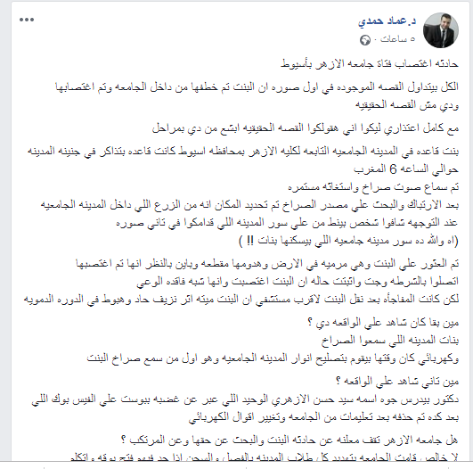واستطردت: علمت الفتيات بأنه وجدت الفتاة مغتصبة داخل الأرض الزراعية الموجودة داخل المدينة الجامعية للبنات فجر اليوم التالي (أمس) في حدود الساعة ٢ ونصف فجرًا – عندما حضرت سيارة إسعاف خارجية.. وجدت البنت نازفة غير واعية؛ ونقلت لمستشفى الأزهر التابع للكلية.