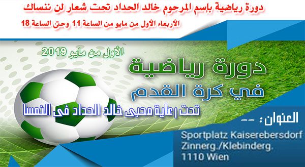 ينظم محبى الراحل خالد الحداد فى النمسا دورة رياضية لكرة القدم تحت شعار ” لن ننساك ” ، تخليداّ لروح فقيد ذلك يوم الأربعاء الموافق الأول من مايو 2019 ، تبدأ الدورة من الساعة الحادية عشر صباحاّ وتمتد حتى الساعة السادسة مساءّ