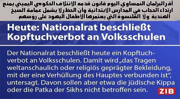 أقر مجلس النواب النمساوي مشروع قانون قدمه الائتلاف الحكومي اليميني يمنع ارتداء الحجاب في المدارس الابتدائية.