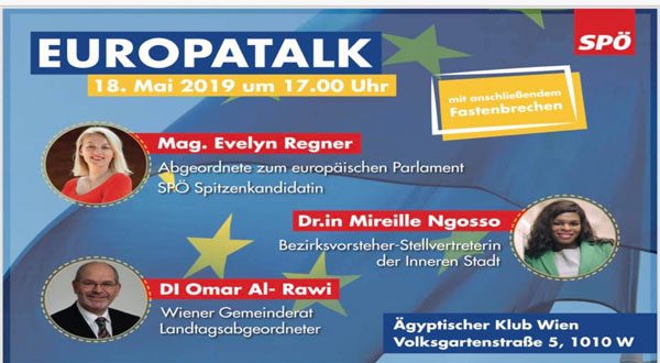 ينظم النادى المصرى يوم السبت القادم الموافق 18 من مايو ، فى تمام الساعة الخامسة عصراّ ، لقاء وحوار مع عدد من الشخصيات البارزة ، فى الحزب الإشتراكى النمساوى الـ “SPÖ” للتعرف عليهم مع عرض برامجهم الإنتخابية الخاصة بـ أنتخابات البرلمان الأوروبى المزمع إجرائها يوم 26 من الشهر الجارى ومنهم : —