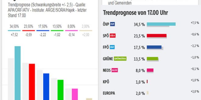 وحسب هذه أستطلاعات الساعة الخامسة بعد غلق أبواب اللجان الأنتخابية، حصل حزب الشعب المحافظ على 34.5% بزيادة 7 % من الأصوات، وحصل الحزب الاشتراكي على 23% بخسارة 0,6 في المائة ، في خسر حزب الحرية النمساوى الشعبوي اليميني 2.2% وحصولة على 17,5 في المائة وخسر حزب الخضر واحد في المائة بحصولة على 13,5 في المائة ، بينما حصل حزب نيوز على 0,8 في المائة بلخسارة 0,1 في المائة عن الانتخابات السابق