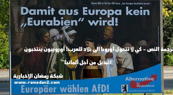 اللافتة وهي واحدة من لافتات حملة حزب البديل “التعلم من تاريخ أوروبا” التي حور في إطارها الحزب العديد من اللوحات الفنية للدفع بأجندة معادية للأجانب في الانتخابات الأوروبية تبين سوقا للعبيد للرسام الفرنسي جان ليون جيروم (1866). ويتعلق الأمر في تلك اللوحة بتحفة فنية شرقية تعبر عن مضمون عنصري من الفترة الاستعمارية. وتم توظيف هذه اللوحة الفنية أيضا لتذكير الناخبين بما حصل في كولونيا في ليلة عيد الميلاد في 2015.