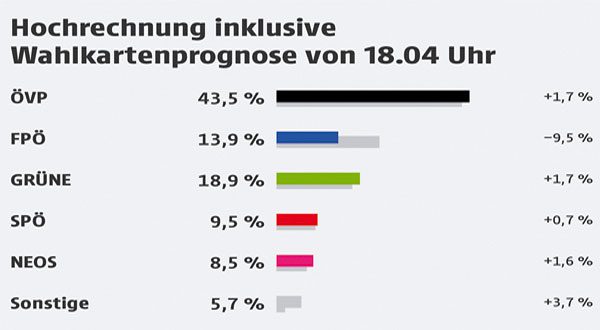 وفي ظل حملة هيمنت فيها المسائل البيئية بدل قضية الهجرة التي سيطرت على لاانتخابات الماضية  ، ومن خلال النتائج الأولية حل حزب الشعب “ÖVP” الذي يترأسه المستشار النمساوي السيد سيباستيان كورتس , قد اكتسح حزبة هذه الانتخابات واستطاع تحقيق المرتبة الأولى بحصولة على نسبة 43,5 % أي بزيادة 1,7 مقارنة مع الانتخابات الماضية