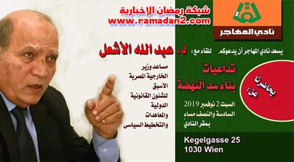 تتشرف أدارة نادى المهاجر بالحى الثالث – فيينا ، بدعوة حضراتكم إلى الإستماع لمحاضرة هامة يلقيها عليكم الأستاذ الدكتور عبدالله الأشعل أستاذ القانون الدولى والعلاقات الدولية فى الجامعة الأمريكية والبريطانية و جامعة القاهرة ، ومساعد وزير الخارجية الأسبق للشئون القانونية الدولية والمعاهدات والتخطيط السياسى