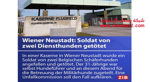 أعلن الجيش النمساوى منذ قليل اليوم الخميس الموافق 14 من سبتمبر أن أحد عناصره، وعمره 31 عاما، قتل على ما يبدو بسب عقر كلبين في الخدمة له بينما كان مكلفا بتغذيتهما في كتيبة