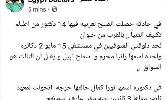 وفي السياق ذاته، تداول عدد من صفحات موقع التواصل الاجتماعي “فيس بوك”، عقب وقوع الحادث صور رسائل نصية عبر تطبيق “واتساب”، بين الطبيبات وإدارة صحة المنيا، والمنسقة الخاصة بتدريب سرطان الثدي في القاهرة.
