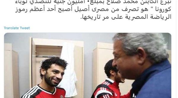 وكتب الوزير السابق عبر حسابه على موقع التغريدات القصيرة “تويتر” :« تبرع الكابتن محمد صلاح بمبلغ20مليون جنيه للتصدي لوباء ” كورونا ” هو تصرف من مصرى أصيل أصبح أحد أعظم رموز الرياضة المصرية على مر تاريخها».