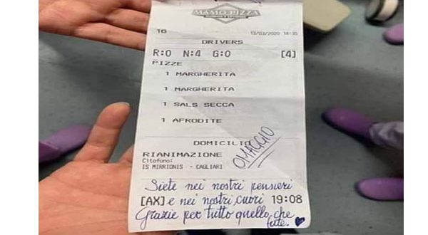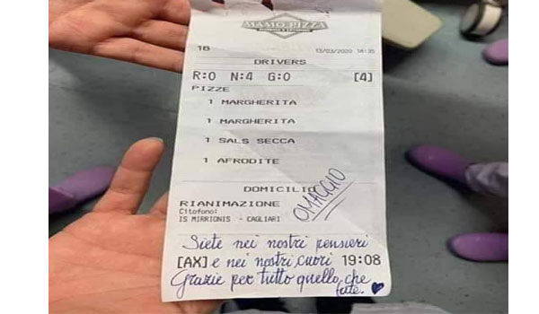 وعندما وصلت البيتزا وجدوا الفاتورة مدون عليها بخط اليد “بالمجان .. نحن نفكر فيكم وأنتم في قلوبنا .. شكرا علي كل المجهودات التي تقومون بها” ..