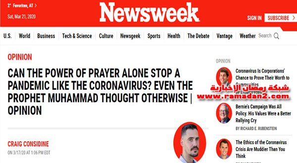 التقرير نشرته مجلة “نيوزويك”، بعنوان “هل يمكن لقوة الصلاة وحدها إيقاف وباء مثل كورونا؟ حتى الرسول محمد كان له رأي آخر”.