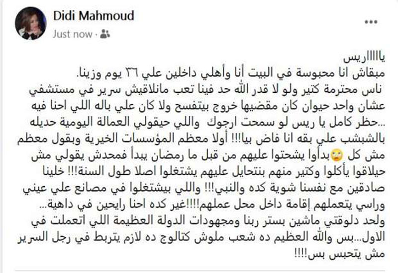 ودوّنت “داليا” عبر صفحتها الشخصية بموقع التواصل الاجتماعي الفسبوك قائلة: “مبقاش أنا محبوسة في البيت أنا وأهلي داخلين على 36 يوم وزينا ناس محترمة كتير، ولو لا قدر الله حد فينا تعب مانلاقيش سرير في مستشفى عشان واحد حيوان كان مقضيها خروج بيتفسح ولا كان على باله اللي احنا فيه”.