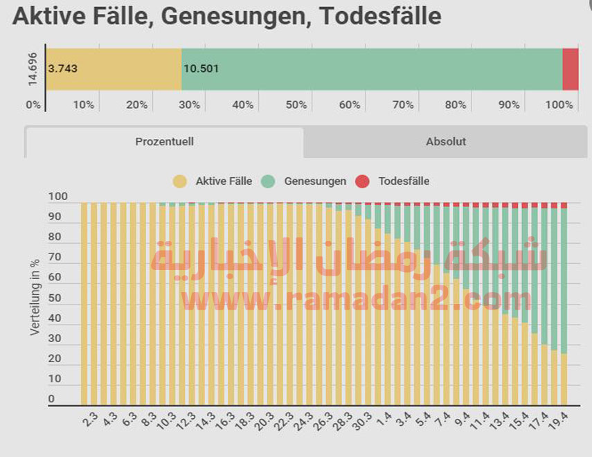 بعد أن أودى فيروس كورونا المستجد بحياة المئات من النمساويين، سجلت النمسا اليوم الأحد الموافق 19 من أبريل نسبة انتشار فايروس هي الأقل منذ بدء أزمة كورونا ليتضاعف عدد المصابين الإجماليين البارحة بنسبة 0.5% حيث أصيب 78 شخصاً فقط بالفايروس خلال اليوم