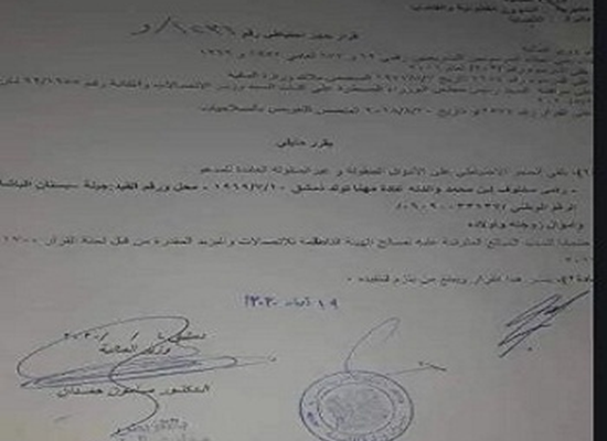 وتداول رواد مواقع التواصل الاجتماعي، صورة من القرار، حيث حملت الوثيقة تاريخ 19 مايو وعليها توقيع وزير المالية، وجاء فيها أن “الحجز الاحتياطي” يأتي ضمانا لتسديد المبالغ المستحقة لهيئة تنظيم الاتصالات في سوريا.