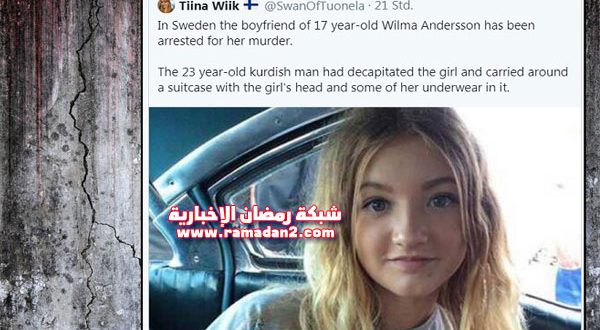 وفي التفاصيل فقد ألقت الشرطة السويدية مؤخرًا القبض على شاب عراقي كردى يدعى «تشيكو أحمد شاباز -23 عامًا»، للأشتباه بإرتكابه جريمة قتل حبيبته السويدية «ويلما أندرسون – 17 عامًا»، وذلك بعد العثور على رأسها داخل حقيبة سفر تخص حبيبها السابق، داخل المسكن الذى كان يجمعهما في مدينة أوديفالا بمحافظة فسترا يوتالاند جنوب غرب السويد.