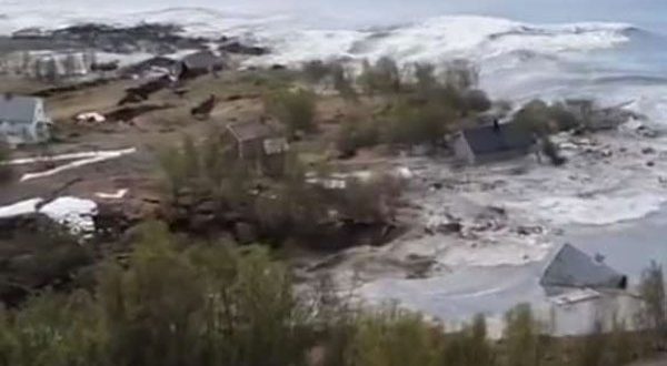 وتم تصوير الفيديو بطائرات بدون طيار في الهواء، حيث تسبب انهيار أرضي قوي إلى جرف قرية صغيرة مؤلفة من ثمانية منازل إلى البحر، في مقاطعة فينمارك في أقصى شمال النرويج.