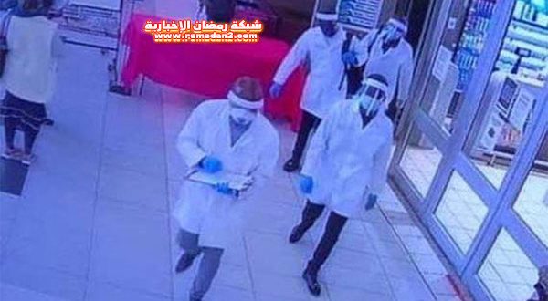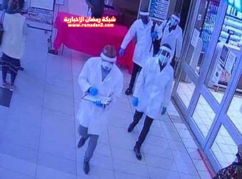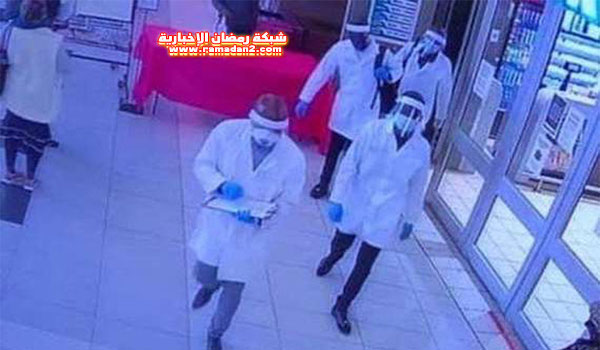 تنكر أربعة من أفراد عصابة في زي أخصائيين في مجال الرعاية الصحية بالأقنعة والدروع الواقية والقفازات، وسرقوا رواد سوبر ماركت.