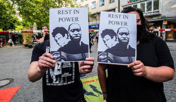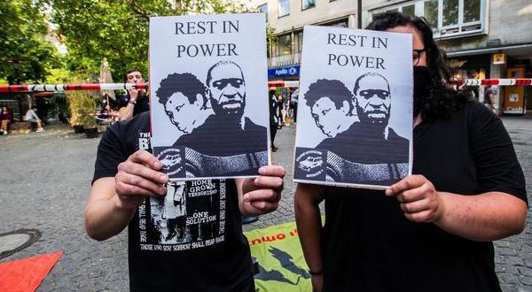 لافتات تحمل صور جورج فلويد وأوري جالو في مدينة ميونيخ. هذه اللافتات حملها محتجون على مقتل المواطن الأمريكي خلال اعتقاله، مطالبين أيضا بإعادة فتح التحقيق في حادثة مقتل لاجئ سيراليوني ومهاجرين آخرين في ألمانيا.